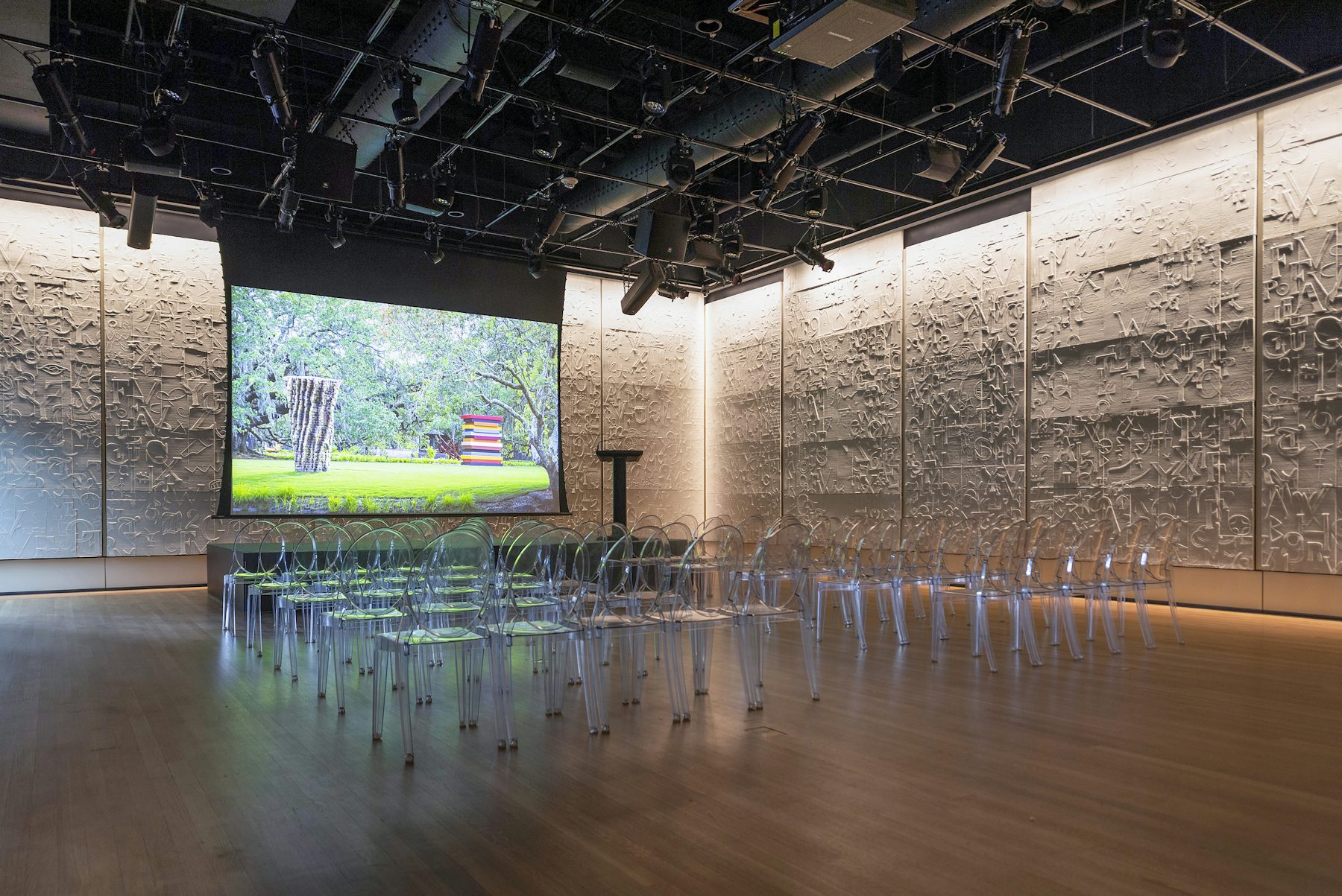 The space is simultaneously an exhibition. 85 plaster panels drawn from renowned New Orleans sculptor Enrique Alférez’s monumental relief “Symbols of Communication” adorn the walls.