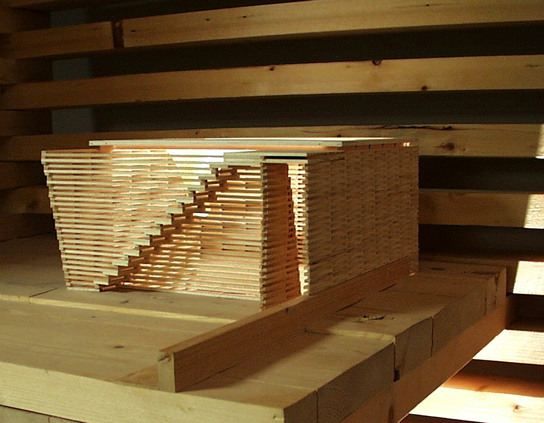 The enclosure is a quill-like weave of cypress that permits light and air to flow through the pavilion with no loss of privacy. Its stacked construction echoes the practical directness of wood boards in the lumber yard or freight pallets at the quayside. From its exterior, the pavilion assumes a spirit of mystery and enigma; from the interior, one of privacy and enclosure.
